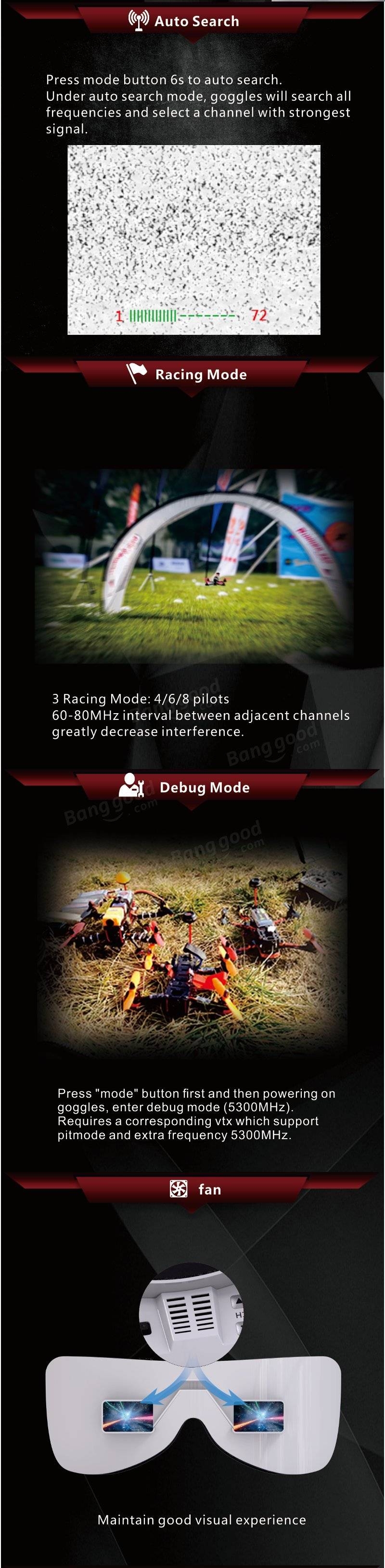 - Has 3 Racing Modes : 4/6/8 pilots. 60-80MHz interval between adjacent channels greatly decrease interference.
