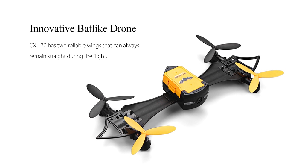 CHEERSON CX - 70 RC quadcopter features the extremely portable and wearable wrist watch design, striking a new high in the development of UAV. CHEERSON CX - 70 RC drone bears a vivid resemblance of the bat whose wings can be rolled but they remain straight during the flight.