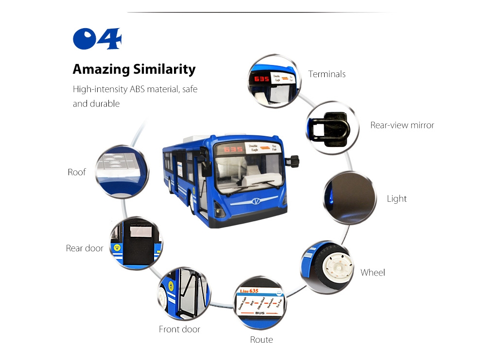 Double E E635 - 001 functions like a real bus. Its doors can be opened and closed, and its lights will be switched on when the bus turns left / right. Everything is considered, including the honk, the engine sound, and even the ring reminding passengers to get off. Additionally, made of high-intensity ABS, the RC model is safe and durable.