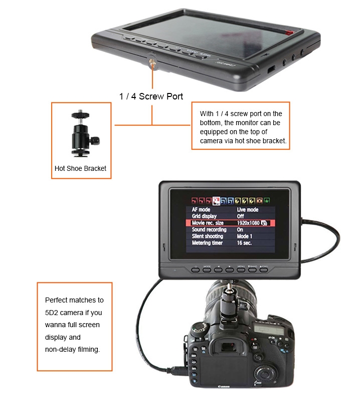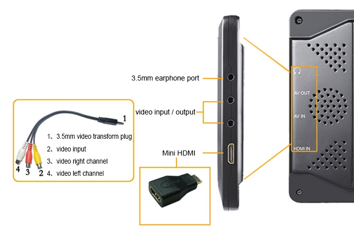 Package Contents: 1 x Monitor, 1 x Lipo Battery, 1 x Adapter, 1 x Sunshine Cover, 1 x 3.5mm AV Cable, 1 x English User Manual |