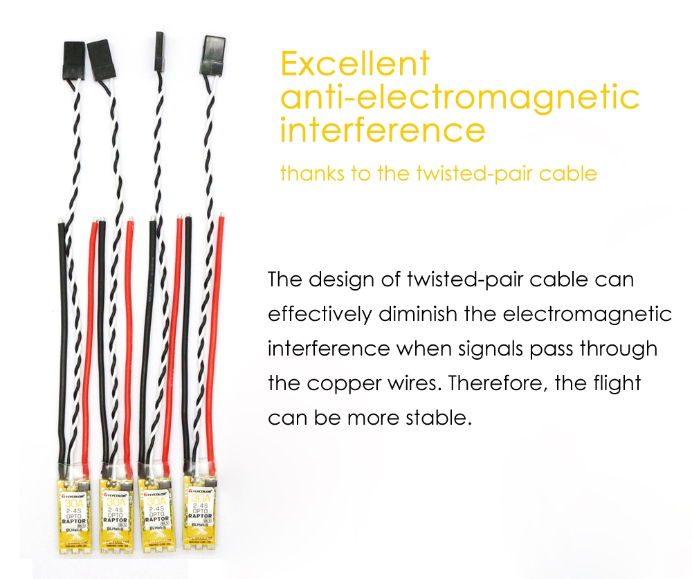 - Excellent anti-electromagnetic interference due to the twisted-pair cable. The design of twisted-pair cable can effectively diminish the electromagnetic interference when signals pass through the copper wires. Therefore, the flight can be more stable.
