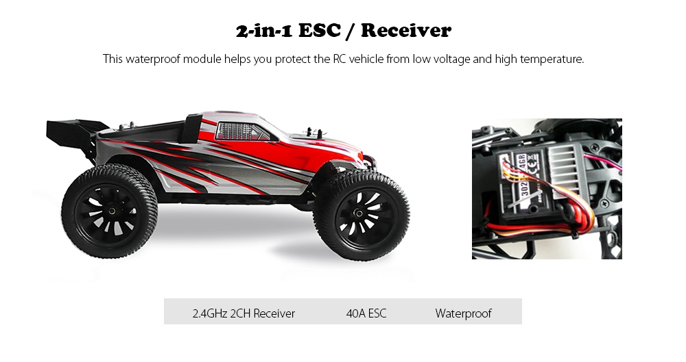 - 2-in-1 waterproof ESC / receiver offers protection against low voltage and high temperature
