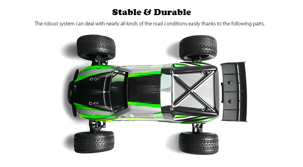 The 2.4GHz 2WD RC car offers you the thrilling speed and stable running. It is capable of handling slopes, meadows, rocky roads, and even driving past puddles. In addition, its 2-in-1 ESC / receiver, equipped with low voltage alarm and protection against high temperature, guarantees the high performance of the vehicle.