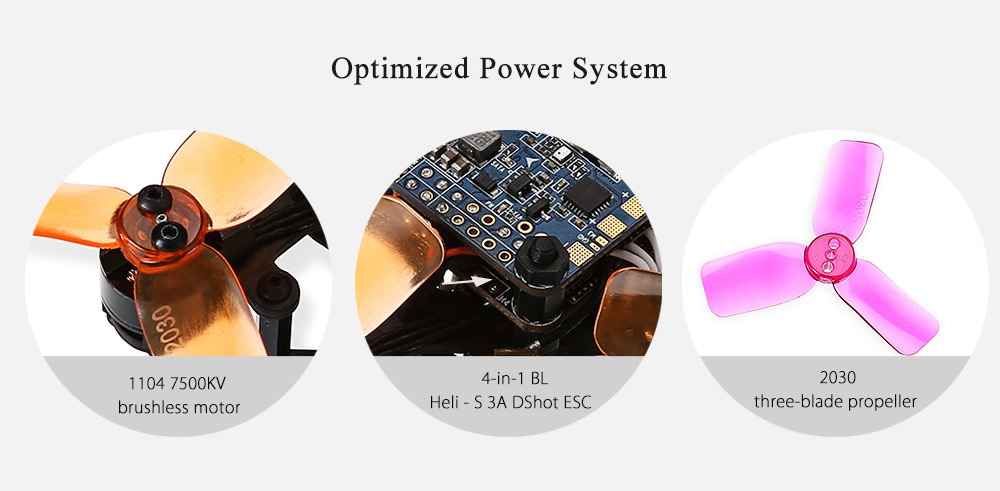 - Powerful 1104 7500KV high RPM brushless motors and 2030 three-blade propellers for thrilling flight