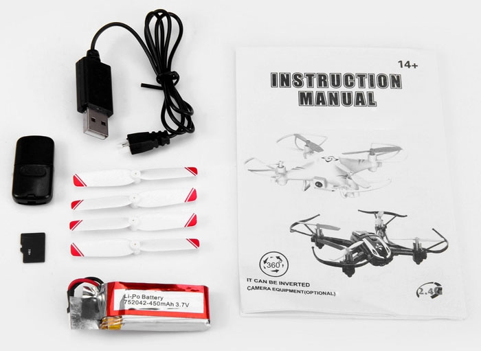 Package Contents: 1 x Quadcopter, 1 x Transmitter, 1 x Camera, 1 x TF Card, 1 x Card Reader, 4 x Propeller, 1 x Battery, 1 x USB Charger, 1 x English Manual |