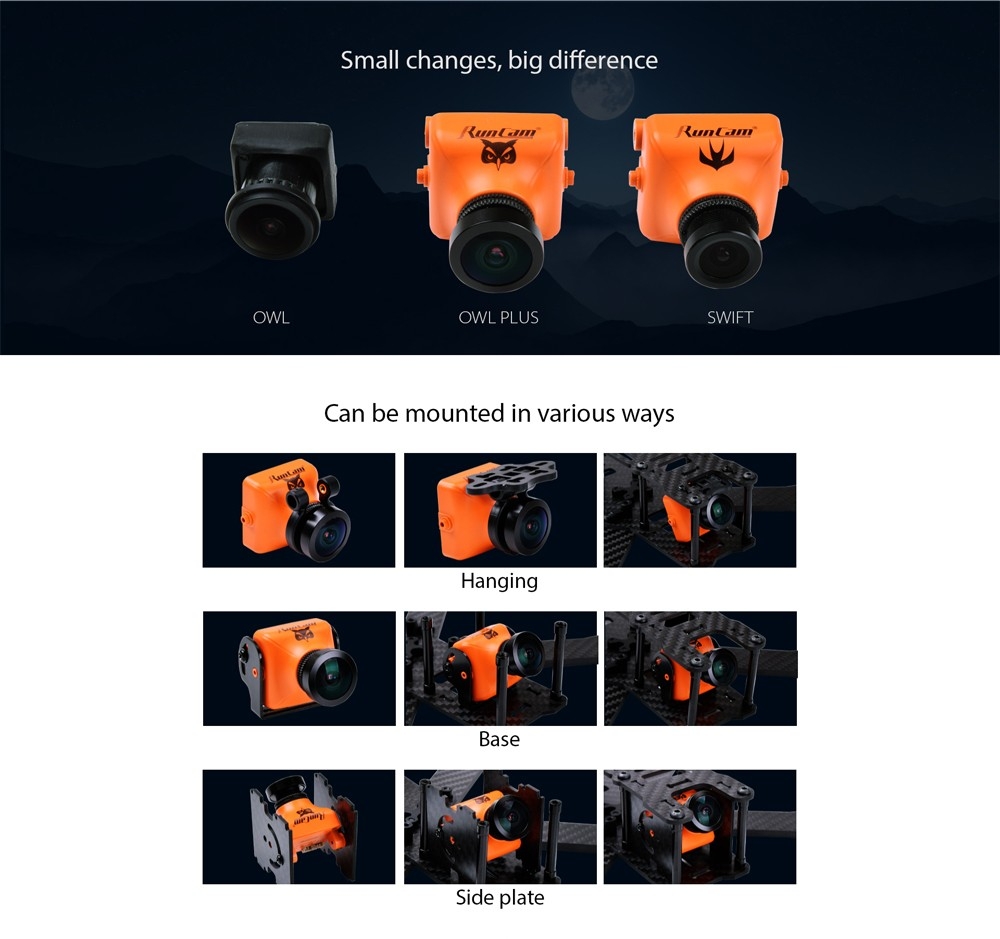 Sharp as owls' eyes, RunCam OWL Plus cameras capture better pictures even in the dimmest lit condition (about 0.0001 Lux). Therefore, with one, you are able to race in the starlight and see farther ahead. Combined with 700TVL, 150-degree FOV, and IR Block, they are exceptionally perfect for FPV.