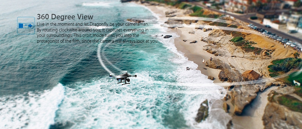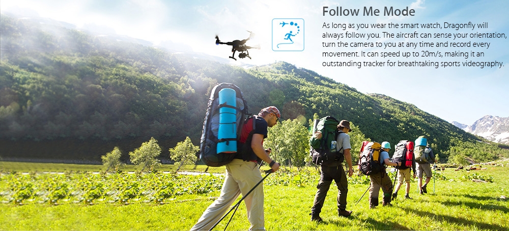 The creative 8-channel smart GPS watch with a micro joystick makes functions like Auto Take off / Land / Return, Hover, Follow Me, Point of Interest, Panoramic Shot extremely accessible at your fingertips. You would love the awesome transmitter-free operation!