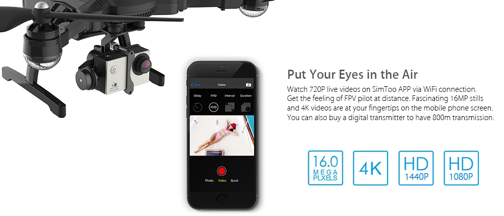 Package Contents: 1 x Aircraft, 1 x Transmitter, 1 x GPS Smart Watch, 1 x 3-axis Gimbal, 1 x 4K Camera, 1 x 5200mAh 11.1V 3S LiPo Battery, 1 x 8GB Micro SD Card, 1 x Hardshell Case |