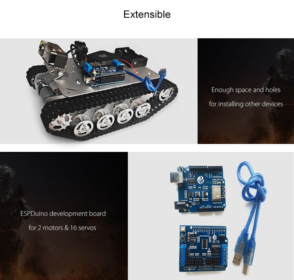 The SZDoit TS100 Intelligent RC Tank uses the ESPDuino development board which is based on ESP8266 and compatible with Arduino UNO R3. With the WiFi connection and 0.3MP camera, you can control the RC tank and record down great things. More importantly, the tank has enough space at the top and supports up to a payload of up to 5kg, which makes it easy to install various peripherals and bring you endless fun.