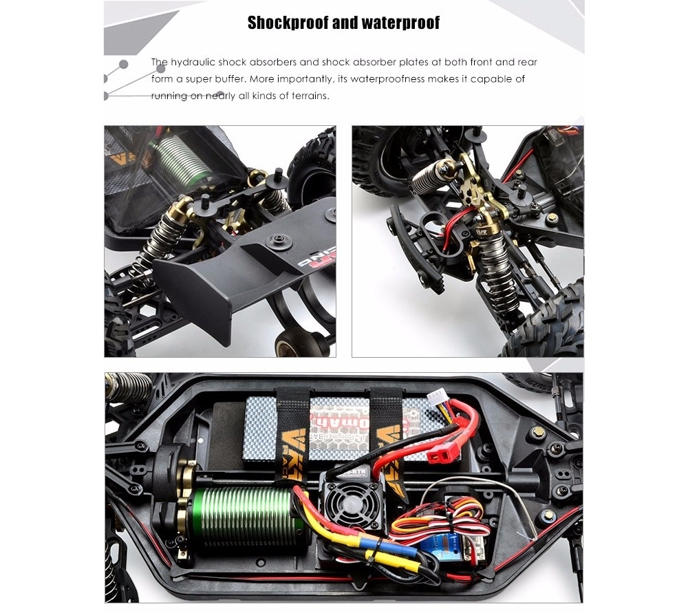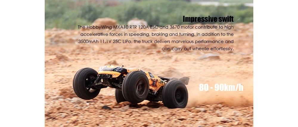 The HobbyWing MXA10 RTR 120A ESC and 3670 high-torque motor coordinate perfectly, in addition, the LiPo battery has a 25C high discharge rate. The system is so powerful that it can achieve wheelie easily.