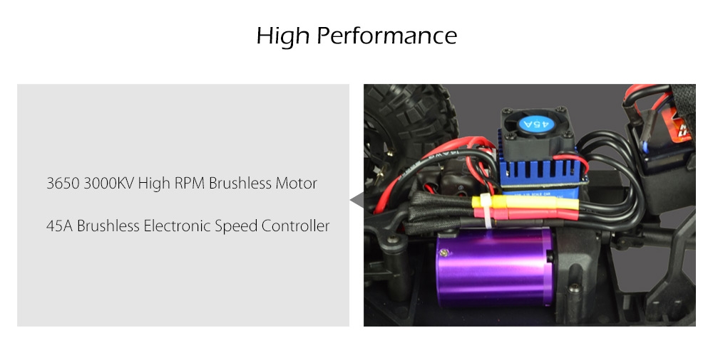 - 40km/h fast speed enabled by the 3650 3000KV brushless motor. ESC can handle up to 45A large current