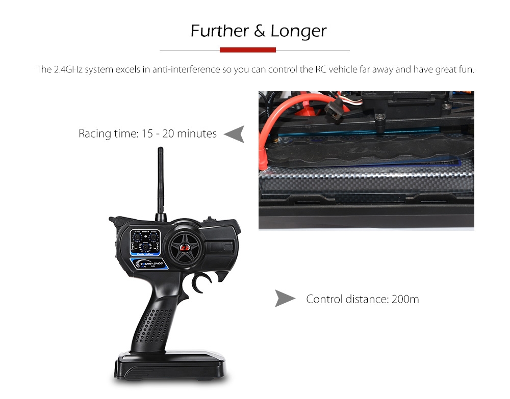 - 2.4GHz 3-channel radio system supports control range of about 200 meters