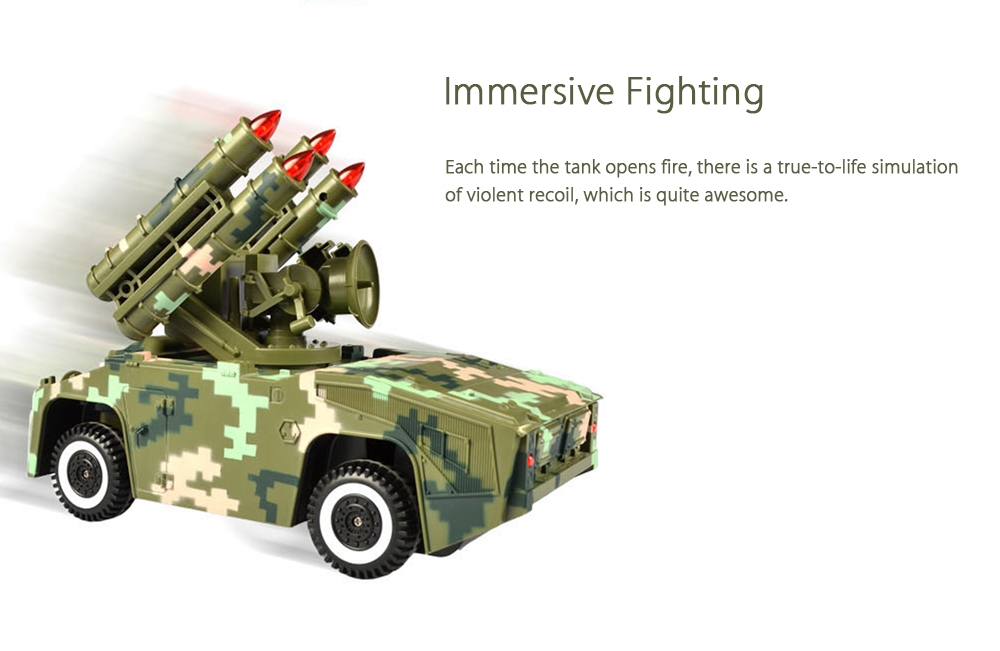 Double E E546 - 001 RC military missile tank can immerse you in the "serious battle" by generating different sound effects and simulating missile projection. Its turret can be rotated via the transmitter, while the angle of the barrel can be moved manually. More interestingly, the auto demonstration function can make the RC tank carry out a series of actions.