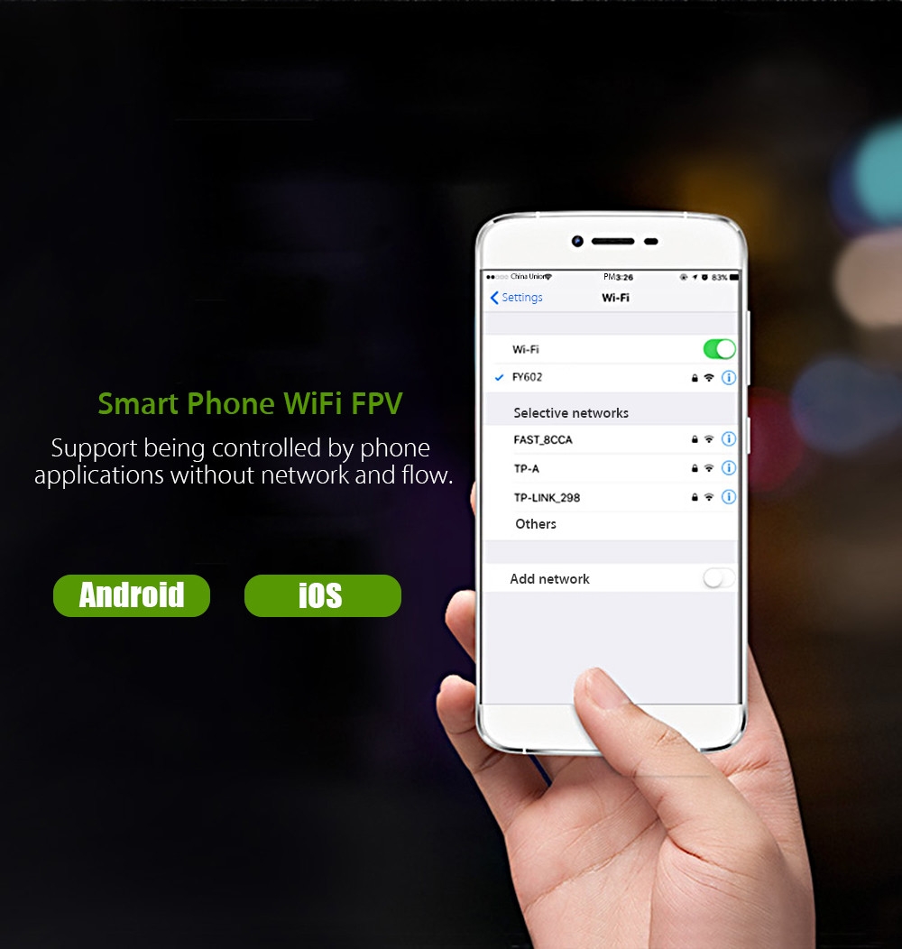 Features: Brushed Version,Camera Functions: Air Press Altitude Hold,Forward/backward,Hand Launching,Headless Mode,Hover,One Key Landing,One Key Taking Off,Roll,Sideward flight,Slow down,Speed up,Turn left/right,Up/down,WiFi Connection,With light Night Flight: Yes Built-in Gyro: 6 Axis Gyro Level: Beginner Level |