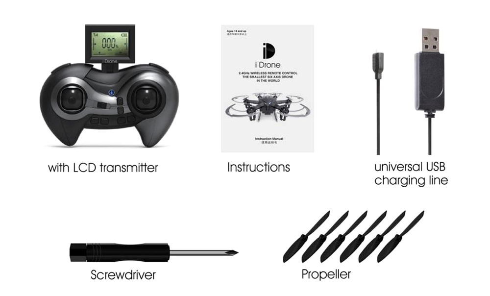 Package Contents: 1 x Hexacopter, 1 x Transmitter, 1 x USB Cable, 6 x Propeller, 6 x Propeller Protector, 1 x Screwdriver, 1 x Manual ( English + Chinese ), 2 x Landing Gear |