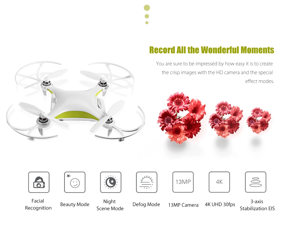 â Crisp images with 13MP camera, 4K UHD video recording, 3-axis stabilization EIS, 2.4GHz / 5GHz WiFi FPV