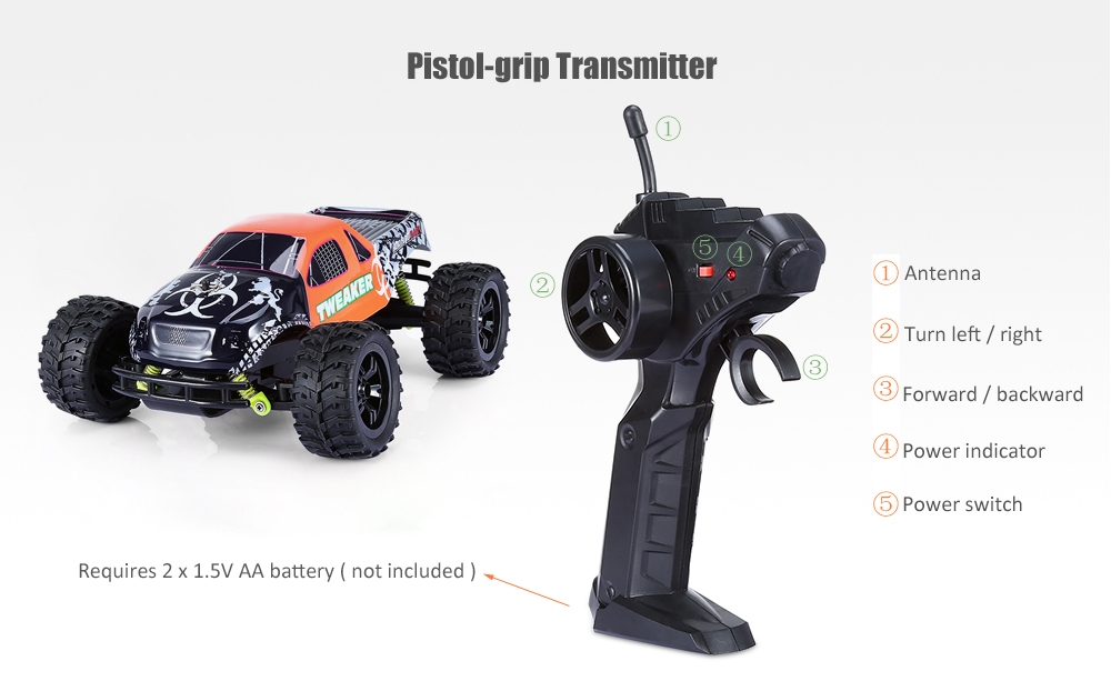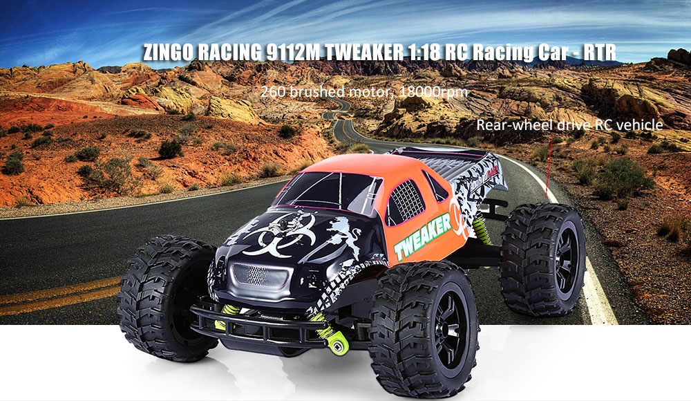 ZINGO RACING 9112M TWEAKER off-road RC car is sure to impress you by its unique appearance. The 1:18 RC vehicle uses the 260 high RPM brushed motor, enabling it to accelerate to the speed of 15km/h. TWEAKER can also cope with tough conditions in off-road running because of its enclosed chassis, independent suspension system and all-terrain tire. It is capable of withstanding big impact with the bumper and PVC shell.